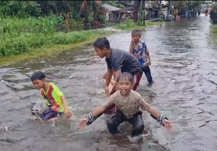 Pantauan di lokasi menunjukkan suasana penuh gelak tawa. Anak-anak tampak menikmati bermain air, bahkan berani bergantungan pada kendaraan yang melintas di jalanan tergenang.