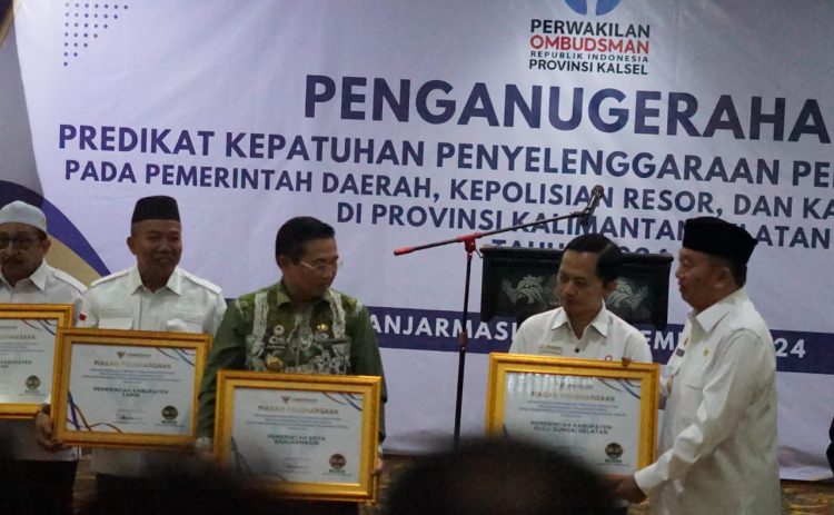 BANJARMASIN, klikkalsel.com – Kota Banjarmasin meraih penghargaan dalam bidang pelayanan publik, saat penganugerahan predikat kepatuhan penyelenggaraan pelayanan publik yang diselenggarakan oleh Kantor Perwakilan Ombudsman RI Provinsi Kalsel.