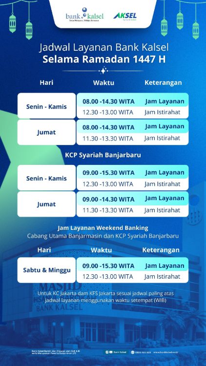 BANJARMASIN, klikkalsel.com – Selama bulan Ramadan 1447 Hijriah, Bank Kalsel menetapkan penyesuaian jam layanan operasional. Kebijakan ini berlaku untuk seluruh kantor cabang dengan pengaturan waktu layanan dan jam istirahat yang disesuaikan.