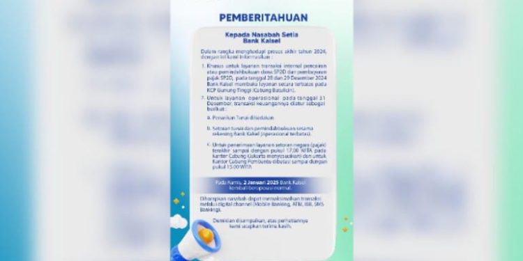 BANJARMASIN, klikkalsel.com – Akhir tahun 2024, Bank Kalsel umumkan pemberitahuan kepada masyarakat dan seluruh nasabah setia.