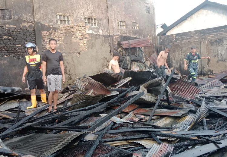 Api melahap habis bagian dalam toko dan menyisakan puing-puing gosong bekas bangunan terbakar. Diketahui toko tersebut milik Haji Murni.