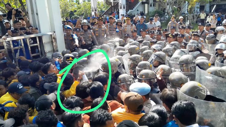 Ketegangan meningkat ketika sebagian massa mencoba menerobos barikade aparat. Di tengah dorong-mendorong tersebut, seorang mahasiswa terlihat menyemprotkan pilox ke arah petugas pengamanan, sehingga memancing emosi dan memicu bentrokan terbuka.