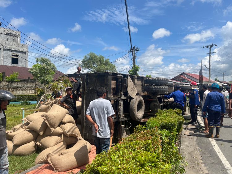 Namun, Truk akhirnya terguling di sisi taman kawasan Jembatan Sulawesi. Karung-karung kacang merah yang berserakan menarik perhatian warga sekitar, yang berbondong-bondong datang untuk melihat langsung proses evakuasi. (airlangga)