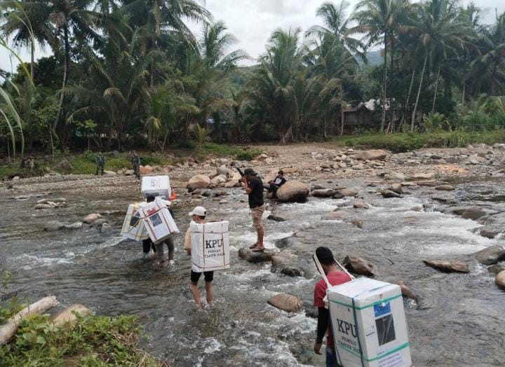 Pendistribusian logistik di Kecamatan BAT ini dibawa dengan menyebrang sungai, mendaki gunung melalui kondisi jalan yang ekstrem dengan dikawal ketat oleh aparat TNI dan Polri.(ziha)