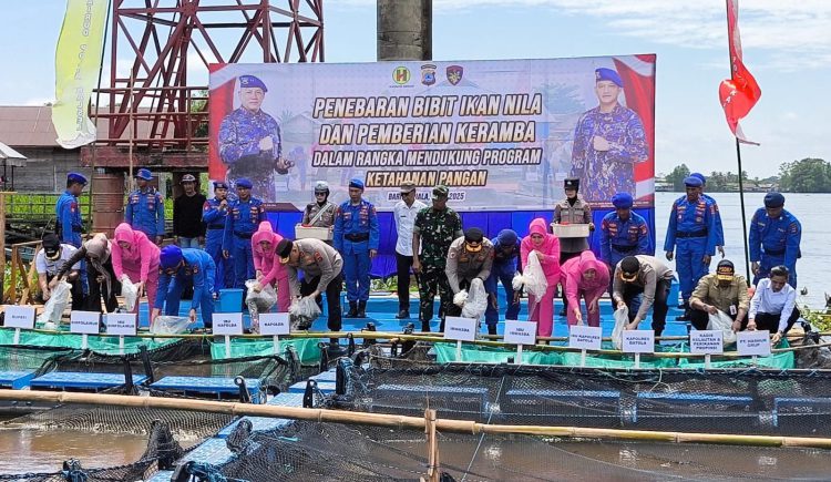 MARABAHAN, klikkalsel.com – Kapolda Kalsel Irjen Pol Rusyanto Yudha Hermawan memimpin penebaran 170 ribu benih ikan air tawar jenis Nila di Sungai Barito, kawasan Jembatan Rumpiang, Desa Bagus, Marabahan,Kabupaten Barito Kuala, Rabu (7/5/2025).