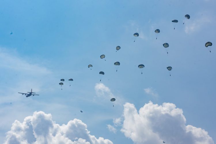 Di udara, Pesawat Hercules menurunkan para prajurit menggunakan terjun payung dalam giat Sikatan Daya dari Komando Operasi Udara (Koopsud) II.
