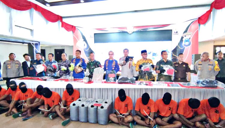 BANJARMASIN, klikkalsel.com – 13 dari 16 orang anggota gerombolan perompak berhasil dibekuk Polda Kalsel atas kasus pembajakan kapal TB Royal yang bermuatan ribuan kilo liter (KL) minyak Fame di perairan Tanjung Selatan, Kabupaten Tanah Laut. Gerombolan perompak tersebut menyergap 14 awak kapal dan memindahkan muatan minyak fame ke kapal lain.
