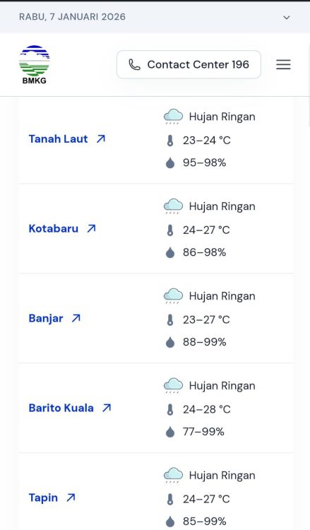 BANJARMASIN, klikkalsel.com – Badan Meteorologi, Klimatologi, dan Geofisika (BMKG) melalui laman resminya mengeluarkan peringatan dini cuaca untuk wilayah Kalimantan Selatan, Rabu (7/1/2026).