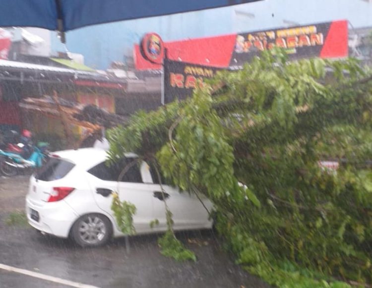 Pohon tumbang itu menimpa mobil sedan yang terparkir di depan rumah makan di kawasan Bundaran Kamboja tersebut.