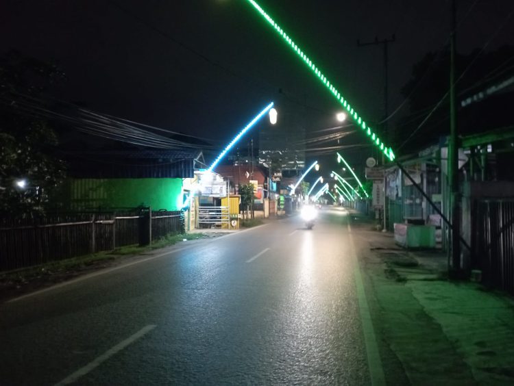 Pantauan di lokasi, umbul-umbul dan bambu-bambu berdiri berjajar di tepi jalan, dihiasi lampu-lampu LED berwarna-warni yang memancarkan cahaya indah di malam hari.