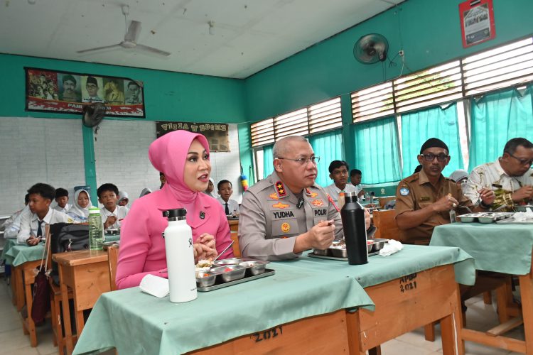 Di kelas 8A, Kapolda didampingi sang istri Yennie Rosyanto Yudha juga sebagai Ketua Bhayangkari Daerah Kalsel berbaur bersama siswa menyampaikan menu program MBG.