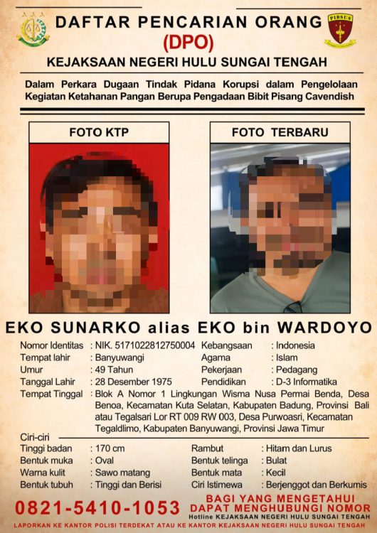 BARABAI, klikkalsel.com – Kejaksaan Negeri Hulu Sungai Tengah (HST) menetapkan daftar pencarian orang (DPO) terhadap ES yang diduga terlibat korupsi pengadaan bibit pisang Cavendish dalam program ketahanan pangan.