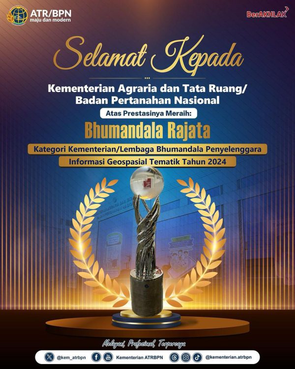 JAKARTA, klikkalsel.com – Kementerian Agraria dan Tata Ruang/Badan Pertanahan Nasional (ATR/BPN) meraih Penghargaan Bhumandala Rajata Perak dengan kategori Kementerian/Lembaga Bhumandala Penyelenggaraan Informasi Geospasial Tematik, pada Senin (04/11/2024).