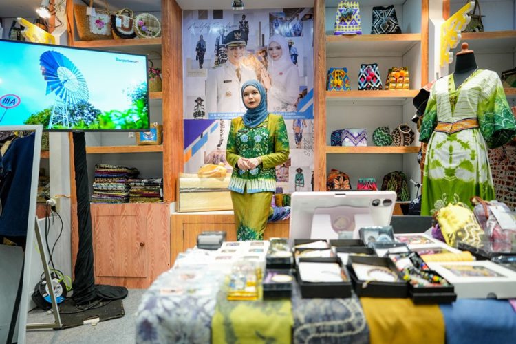 Pada kesempatan itu, Vivi membina langsung Dekranasda Kota Banjarbaru yang membuka stan di Hall Plenary JCC. Tampak stan Dekranasda Kota Banjarbaru ramai diserbu pengunjung.