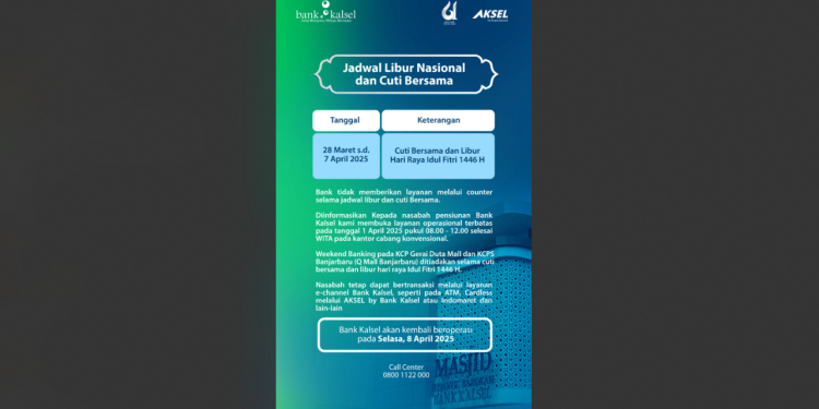 BANJARMASIN, klikkalsel.com – Bank Kalsel mengumumkan jam operasional dan libur Idul Fitri 1446 H/2025 M, yang mana layanan operasional Bank Kalsel ditutup mulai 28 Maret 2025 hingga 7 April 2025.