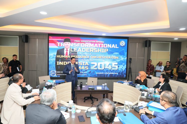 Adapun disertasi dari Menteri AHY berjudul “Kepemimpinan Transformasional dan Orkestrasi Sumber Daya Manusia Kunci Sukses Menuju Indonesia Emas 2045”. Disertasinya ini kemudian diuji oleh delapan orang Dewan Penguji.