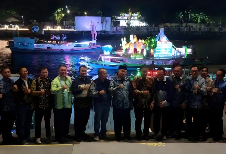 Gemerlap lampu warna-warni memantul di permukaan Sungai Martapura, menciptakan panorama malam yang memukau.