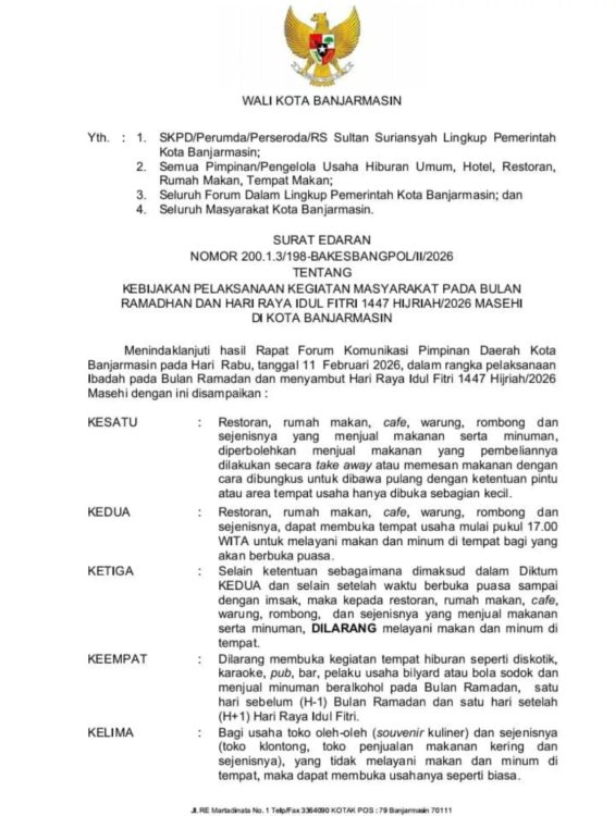 BANJARMASIN, klikkalsel.com – Pemko Banjarmasin resmi menerbitkan Surat Edaran tentang pelaksanaan kegiatan masyarakat selama Ramadan dan Idul Fitri 1447 Hijriah/2026 Masehi.