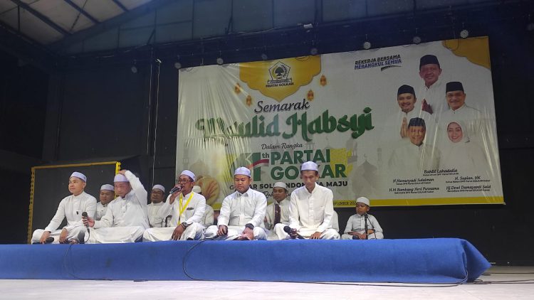 BANJARMASIN, klikkalsel.com – Gelaran Maulid Habsyi berlangsung meriah, menjadi salah satu rangkaian peringatan HUT ke-61 Partai Golkar dengan tema “Golkar Solid Indonesia Maju”, di Taman Budaya Kalimantan Selatan (Kalsel), Sabtu (22/11/2025) malam.