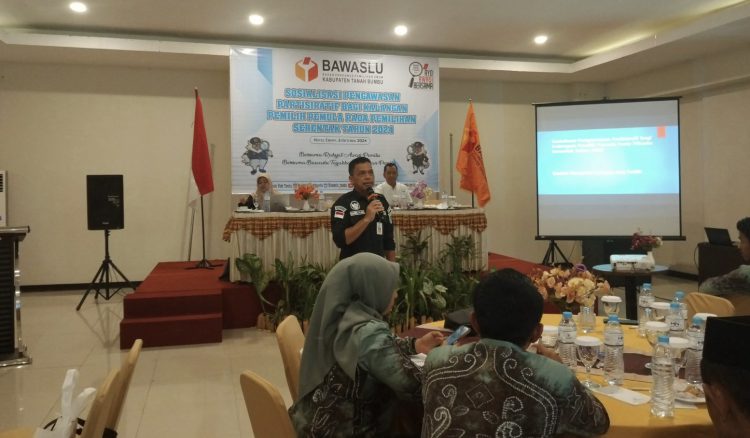 BATULICIN, klikkalsel.com – Kepala Badan Kesatuan Bangsa dan Politik (Bakesbangpol) Tanah Bumbu, Nahrul Fajeri ketika mengisi pemateri sebagai narasumber pada sosialisasi pengawasan yang digelar Badan Pengawas Pemilu (Bawaslu) Kabupaten Tanah Bumbu, bertempat dihotel Ebony Batulicin, Rabu (3/10/2024).