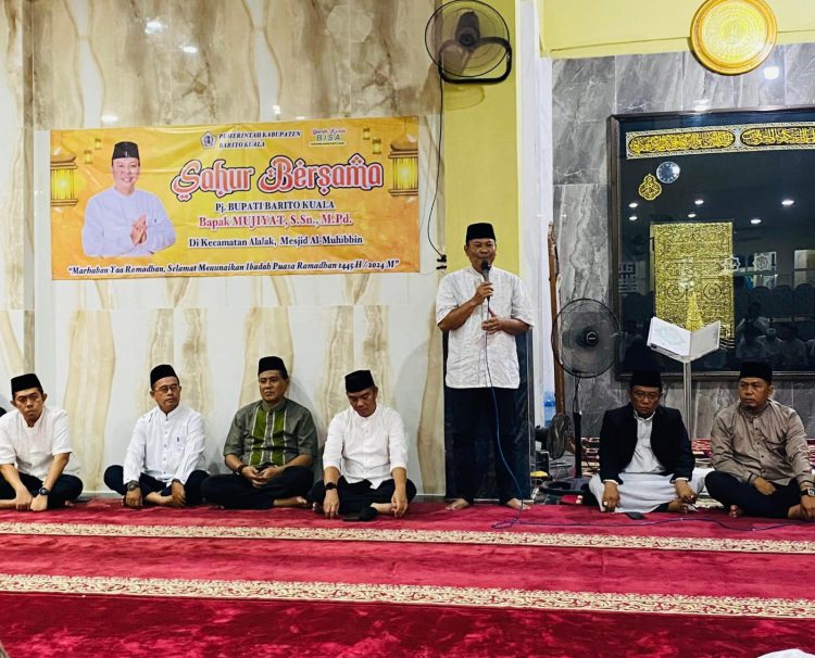 MARABAHAN, klikkalsel.com – Pj Bupati Barito Kuala (Batola) Mujiyat bersama rombongan Sekretaris Daerah Batola Ir. H. Zulkipli Yadi Noor, serta Kepala BNNK dan Pimpinan Bank Kal-Sel Cabang Marabahan melaksanakan sahur bersama ke masjid Al-Muhibbin Komplek Kebun Jeruk, Alalak, Kamis (21/3/2024).
