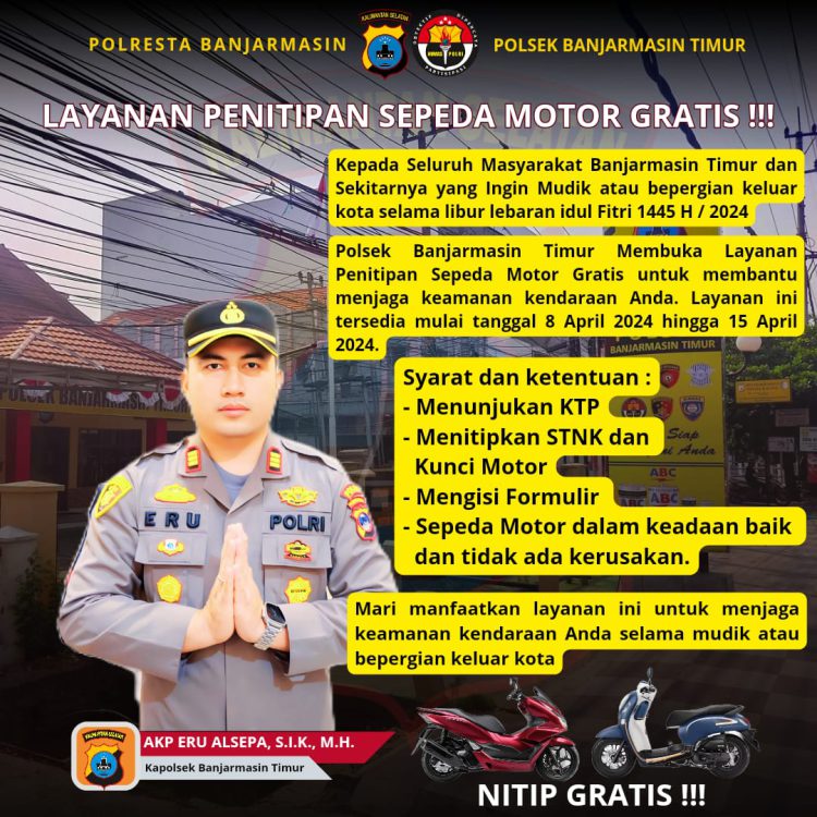 BANJARMASIN, klikkalsel.com.- Polsek Banjarmasin Timur membuka layanan penitipan motor gratis bagi masyarakat yang ingin mudik. Layanan kepolisian ini gratis dan terbuka bagi masyarakat yang ingin mudik tanpa membawa kendaraan bermotornya.