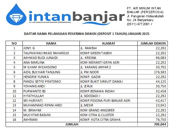 Berdasarkan data deposit 1 tahun pada bulan Januari 2025. Beberapa nama pelanggan yang beruntung antara lain Jony G, Taufan Rachmad Rahardjo, Akhmad Budi Junaidi, dan lainnya. Total diskon yang diberikan mencapai 709.044 Rupiah. (Mada)