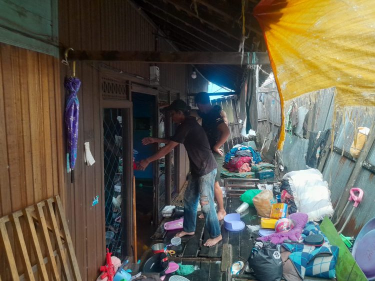 Patah pondasi rumah tersebut juga diperburuk oleh genangan air pasang yang kerap melanda kawasan tersebut.