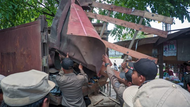 BANJARMASIN, klikkalsel.com – Satuan Polisi Pamong Praja (Satpol PP) Kota Banjarmasin, melakukan penertiban terhadap sejumlah bangunan pedagang kaki lima (PKL) di kawasan Belitung Darat, Banjarmasin Barat.