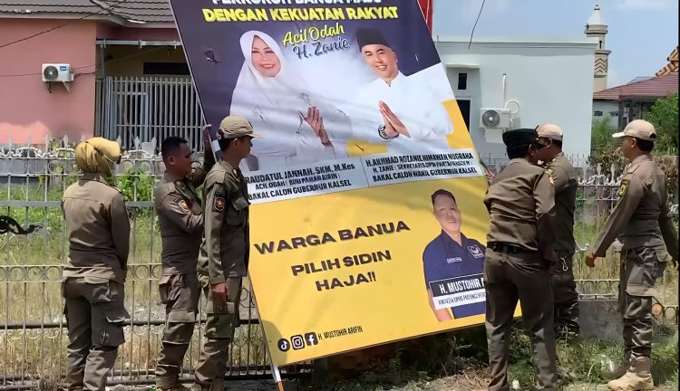 BANJARMASIN, klikkalsel.com – Satuan Polisi Pamong Praja (Satpol PP) Kota Banjarmasin menertibkan reklame berupa baliho bergambar sejumlah bakal pasangan calon Pilkada 2024 di kawasan Banjarmasin Utara, Rabu (18/9/2024).