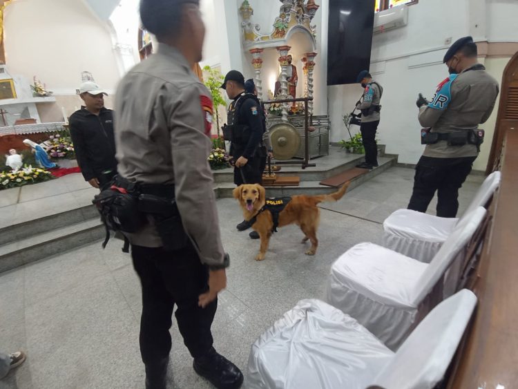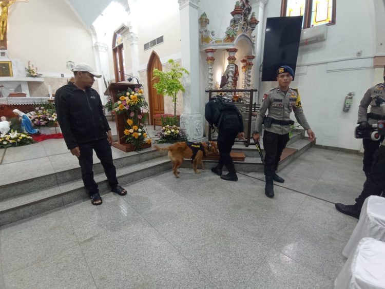 Pantauan di lapangan, petugas menurunkan anjing pelacak dari Tim K-9 guna menyisir seluruh area gereja, mulai dari ruang ibadah hingga lingkungan sekitar.