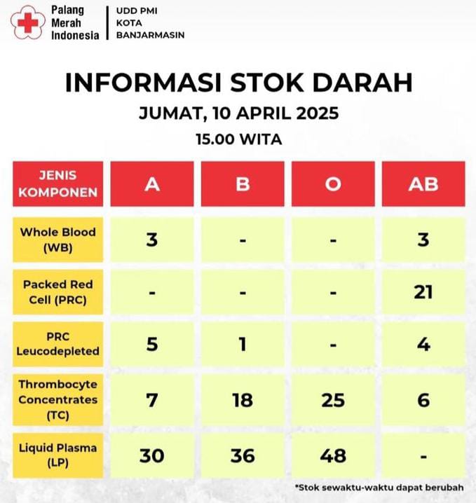 Dari data yang disampaikan Kepala Unit Donor Dara (UDD) PMI Kota Banjarmasin, dr. Aulia Ramadhan Supit, bahwa stok darah saat ini benar-benar kosong.