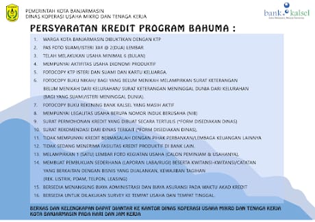1. Pengajuan usulan kredit melalui Dinas Koperasi,Usaha Mikro dan Tenaga Kerja Kota Banjarmasin, dengan melampirkan berkas persyaratan yang sudah ditentukan;