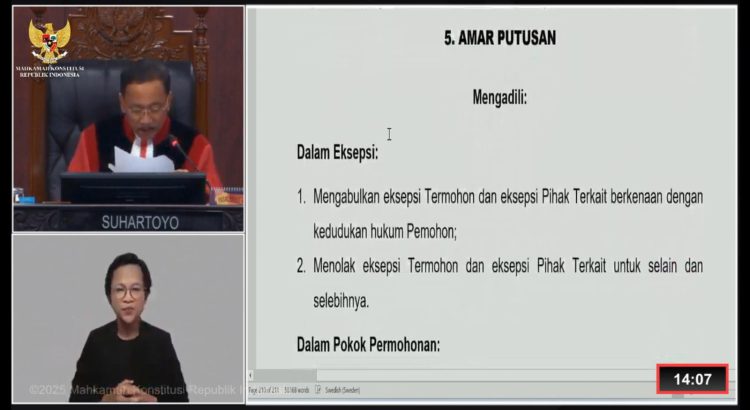 Dalam sidang pengucapan putusan, Senin (26/5/2025) siang, Majelis Hakim MK yang diketuai Suhartoyo memutuskan bahwa perkara nomor registrasi 318/PHPU.WAKO-XXIII/2025 dan 319/PHPU.WAKO-XXIII/2025 tak memiliki kedudukan hukum.