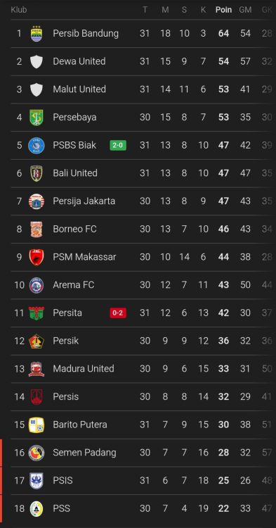 Dari total 7 tim papan bawah tersebut, sudah ada dua klub yang memainkan 31 pertandingan yakni, Barito Putera dan PSIS Semarang. Sedangkan 5 klub lainnya akan bermain di pekan ke 31 pada hari ini, Sabtu (3/5/2025) hingga Senin (5/52025) mendatang.