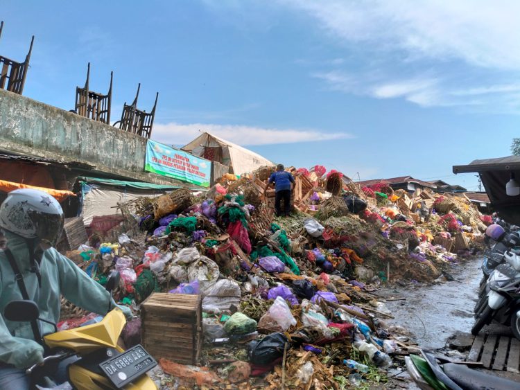 BANJARMASIN, klikkalsel.com – Tumpukan sampah di kawasan Pasar Antasari pasca libur lebaran Idul Fitri kian menggunung. Pemandangan tersebut tentunya membuat tak nyaman bagi para pengunjung pasar yang ingin melakukan transaksi jual beli.